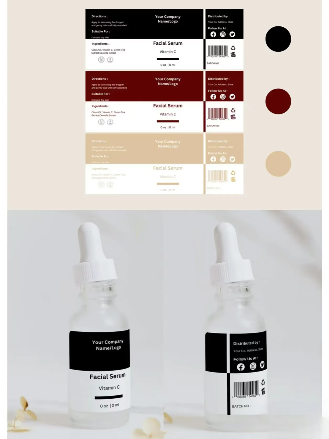 প্রিমিয়াম উপকরণের বিভিন্ন পরিসর থেকে তৈরি, জলরোধী চকচকে ভিনাইল, ম্যাট পেপার, পরিবেশ বান্ধব ক্রাফ্ট পেপার এবং স্বচ্ছ ফিল্ম সহ 20ml বোতল লেবেল।জোজো প্যাক20 মিলি বোতল লেবেলদৃঢ় আঠালোতা, স্ক্র্যাচ এবং আর্দ্রতা প্রতিরোধ, এবং একটি মসৃণ ফিনিস যা লোগো, পণ্যের তথ্য, উপাদান তালিকা এবং ব্যবহারের নির্দেশাবলীর পরিষ্কার মুদ্রণ নিশ্চিত করে। আমরা বিভিন্ন ব্র্যান্ডের চাহিদা মেটাতে CMYK প্রিন্টিং এবং সোনা ও রৌপ্য ফয়েল স্ট্যাম্পিং, UV স্পট আবরণ এবং এমবসিং-এর মতো বিশেষ প্রক্রিয়া সমর্থন করি। কাস্টমাইজড মাপ এবং কোন ফিটিং ত্রুটি ছাড়া, এই লেবেলগুলি আপনার 20ml পণ্যগুলিকে প্রতিযোগিতামূলক বাজারে আলাদা করে তোলার জন্য নিখুঁত প্যাকেজিং সমাধান।