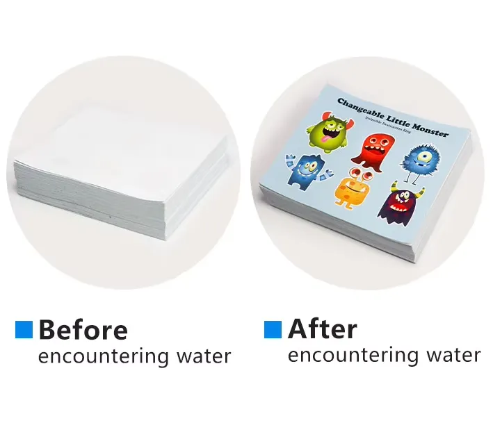 আপনি 3 সেকেন্ডের জন্য রঙ পরিবর্তন জলের সংবেদনশীল লেবেলগুলিকে জলে নিমজ্জিত করতে পারেন সম্পূর্ণভাবে ফুলে উঠবে এবং ছড়িয়ে পড়বে এবং রঙ পরিবর্তনের প্রভাব খুব স্পষ্ট।