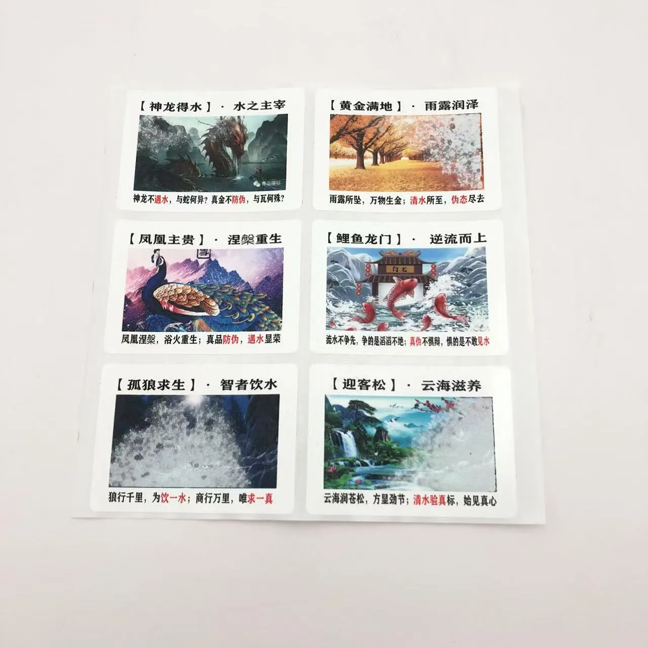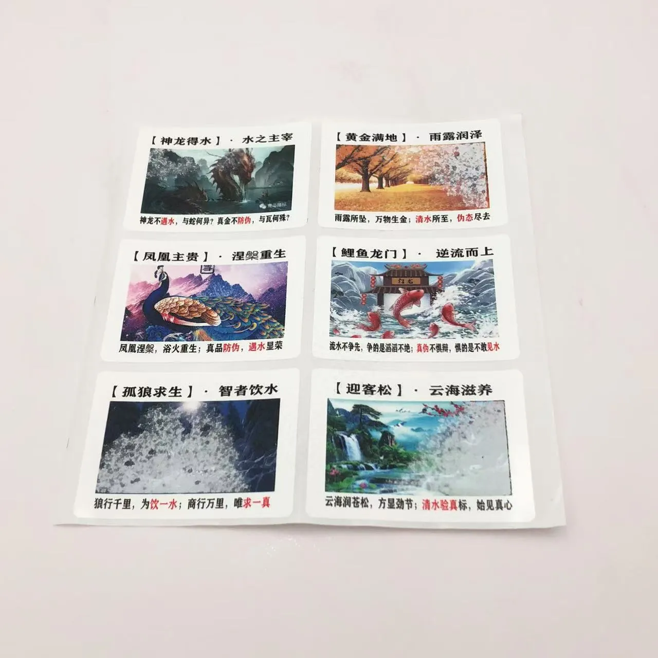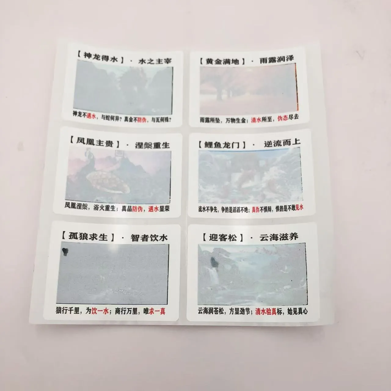 রঙ পরিবর্তন জল সংবেদনশীল লেবেল লুকানো নিদর্শন দৃশ্যমান করতে বা রঙ পরিবর্তন ট্রিগার করতে কালি এবং জলের মধ্যে শারীরিক বা রাসায়নিক বিক্রিয়া ব্যবহার করে। বিশেষ প্রক্রিয়া এবং সরঞ্জাম দিয়ে উত্পাদিত, এই লেবেলগুলি দুর্দান্ত জাল-বিরোধী বৈশিষ্ট্যগুলি অফার করে৷ শুকানোর পরে, নির্দিষ্ট ধরণের তাদের প্রাথমিক অবস্থায় ফিরে যেতে পারে, বারবার ব্যবহার সক্ষম করে।