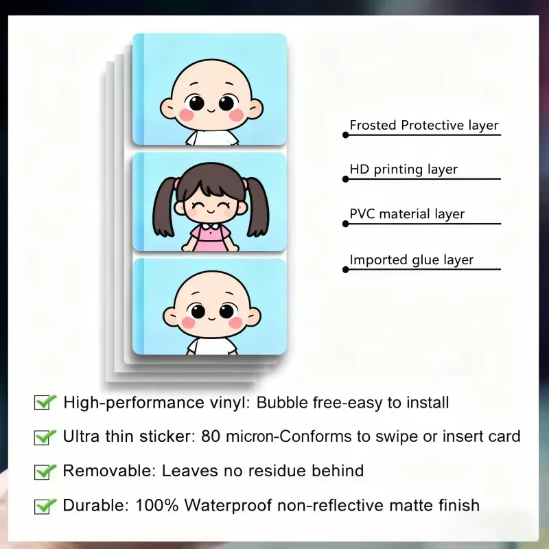 ক্রেডিট কার্ডের স্কিন সাধারণত PVC প্লাস্টিকের মতো উপাদান থেকে তৈরি, যা পাতলা, পেস্ট করা এবং অপসারণ করা সহজ, এবং প্রায়শই স্থায়িত্ব এবং দীর্ঘস্থায়ী চেহারা নিশ্চিত করতে একটি জলরোধী এবং স্ক্র্যাচ-প্রতিরোধী ম্যাট পৃষ্ঠ থাকে৷ এটি জলরোধী, টিয়ার-প্রতিরোধী এবং উচ্চ-রেজোলিউশন UV প্রিন্টিংয়ের সাথে সামঞ্জস্যপূর্ণ।